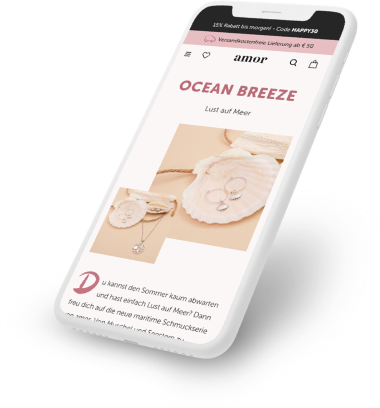 Die Markenbotschaft von AMOR vermittelt sich schon beim ersten Klick dank vieler Designelemente, die harmonisch miteinander verwoben sind und ein vielversprechendes Kundenerlebnis  erlauben. Dieses positive Erlebnis gilt vor allem für das wichtigste Verkaufsportal: die mobile Seite von AMOR.de. Mobil First in Spitzenqualität.
