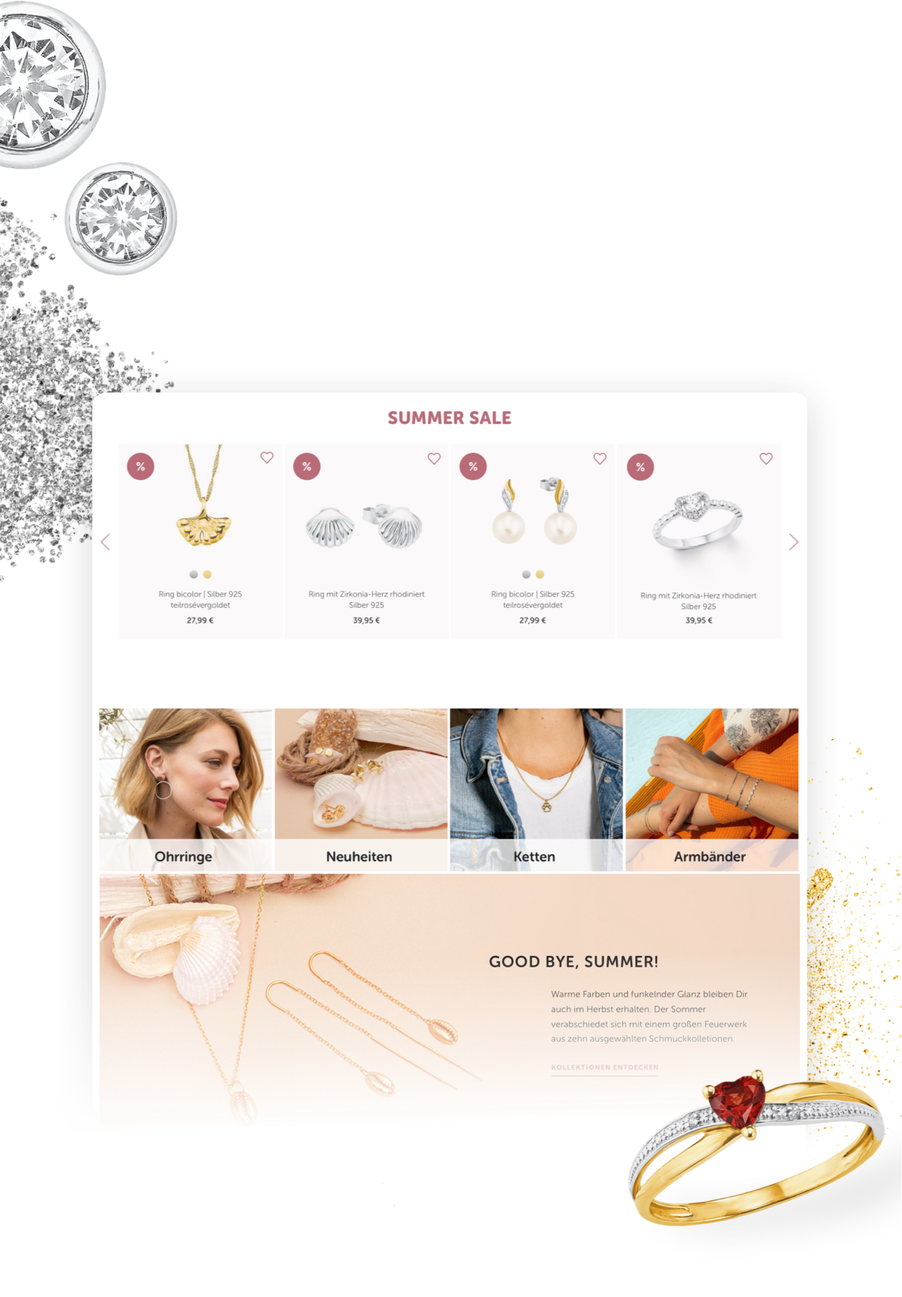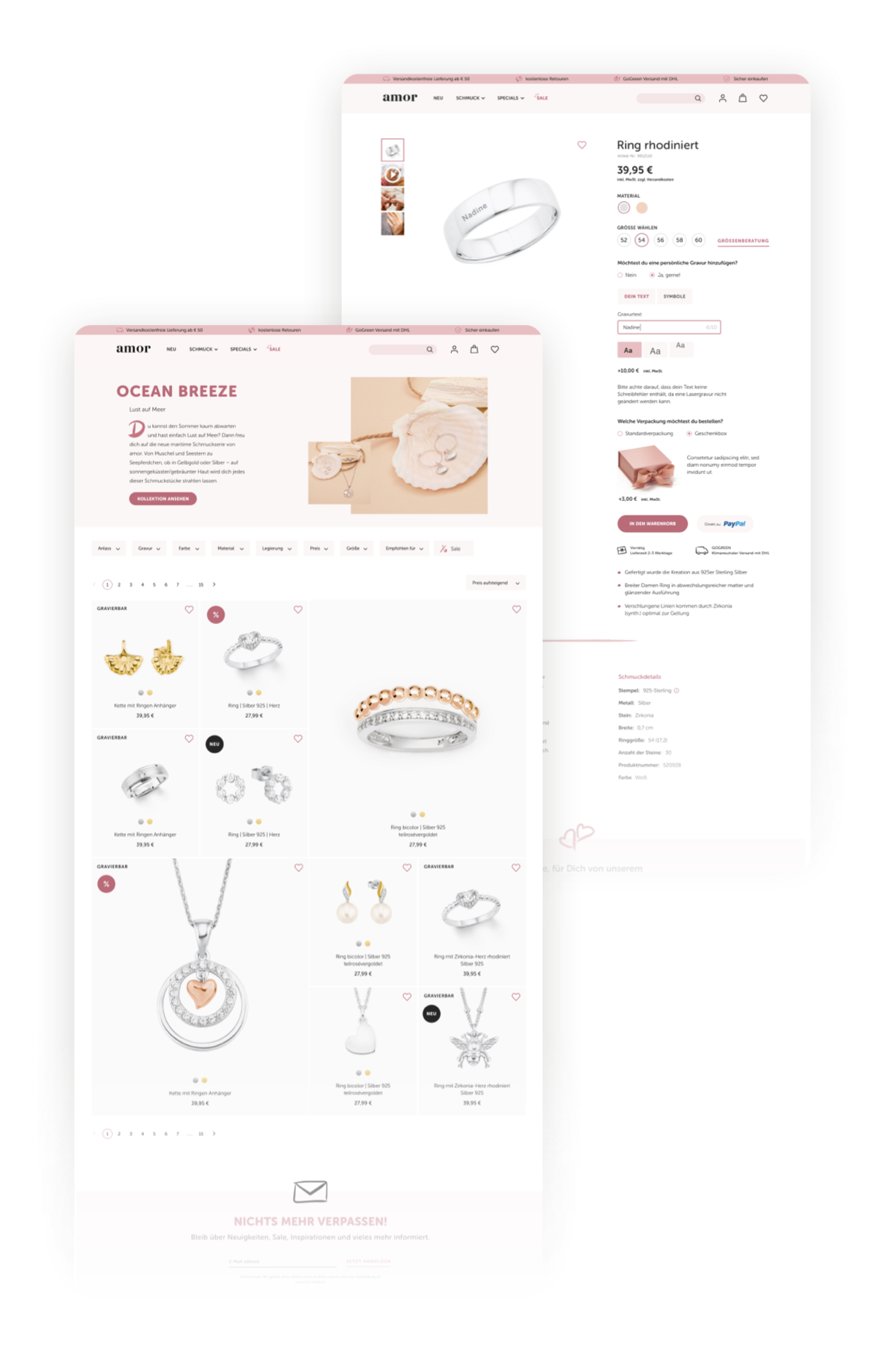 Kategorieseiten und eindeutig gestaltete Filterfunktionen erleichtern es den Besuchern, aus der breit gefächerten Auswahl punktgenau und in Sekundenschnelle die Lieblingsschmuckstücke zu finden und nach Interesse zu clustern. Ergänzende Social-Media-Module tragen die Botschaft der Marke AMOR weiter über die Webseite hinaus in die digitale Erlebniswelt.