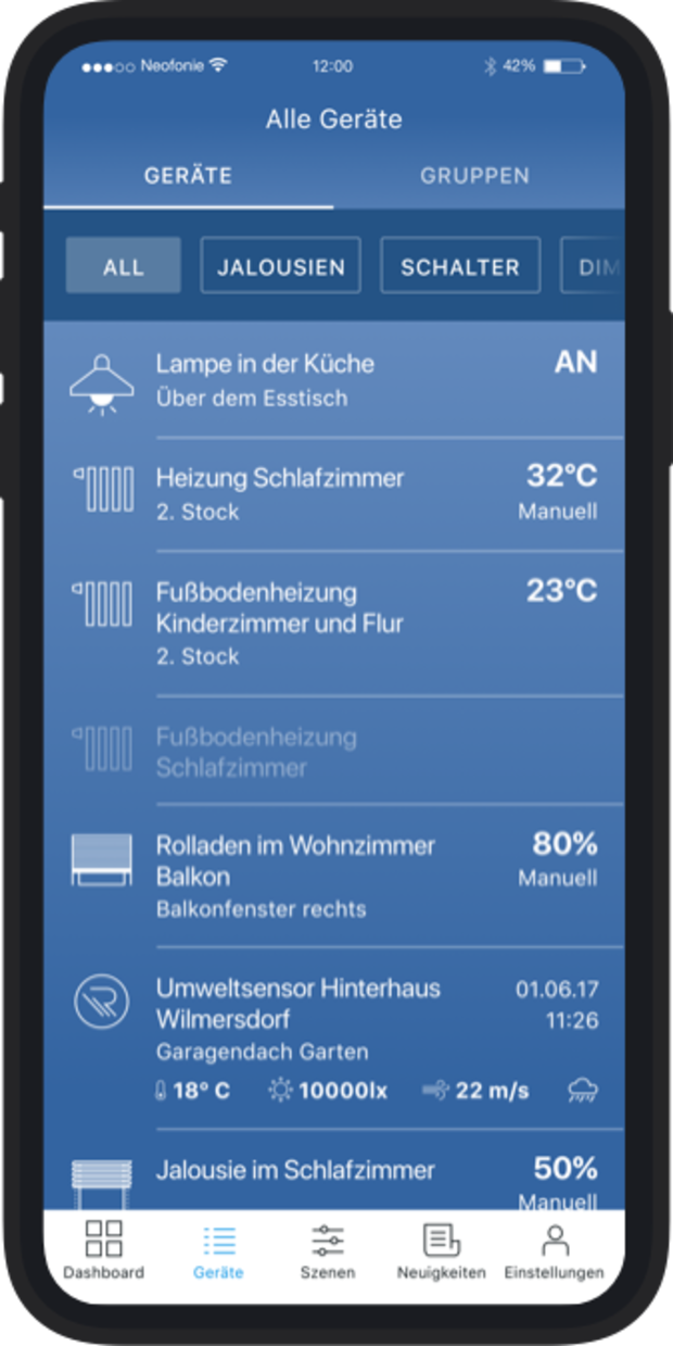Die Erstellung von Gruppen ermöglicht die gleichzeitige Steuerung vieler Geräte. Szenen ermöglichen die einfache Bedienung über konfigurierte Abläufe. So können aus der Ferne Rollläden, Jalousien, Heizungen, Lichter und bis zu 100 weitere RADEMACHER-Funkobjekte bedient werden.
